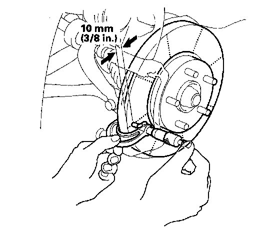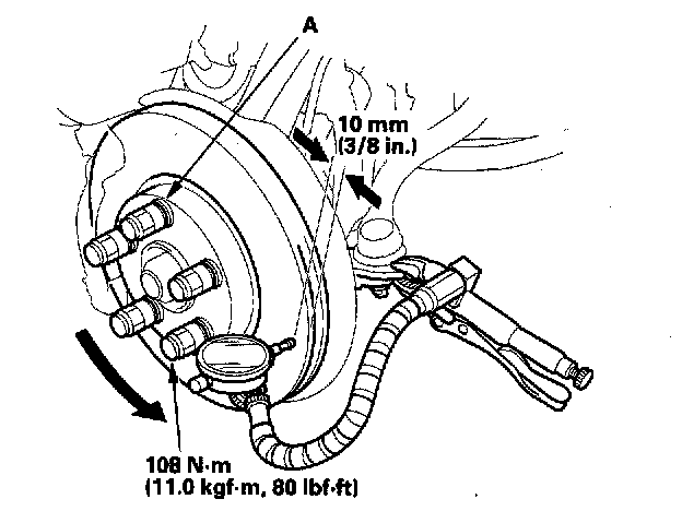 5. Set up the dial gauge against the brake disc as shown, and measure the runout at 10 mm (3/8 inch) from the outer edge of the disc.