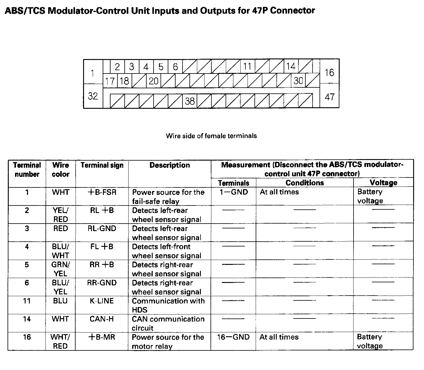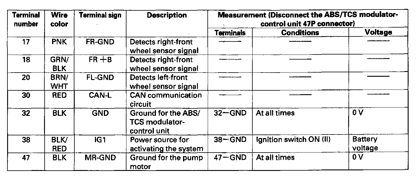 ABS/TCS Modulator-Control Unit Inputs And Outputs For 47P Connector: