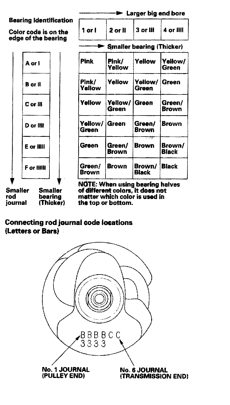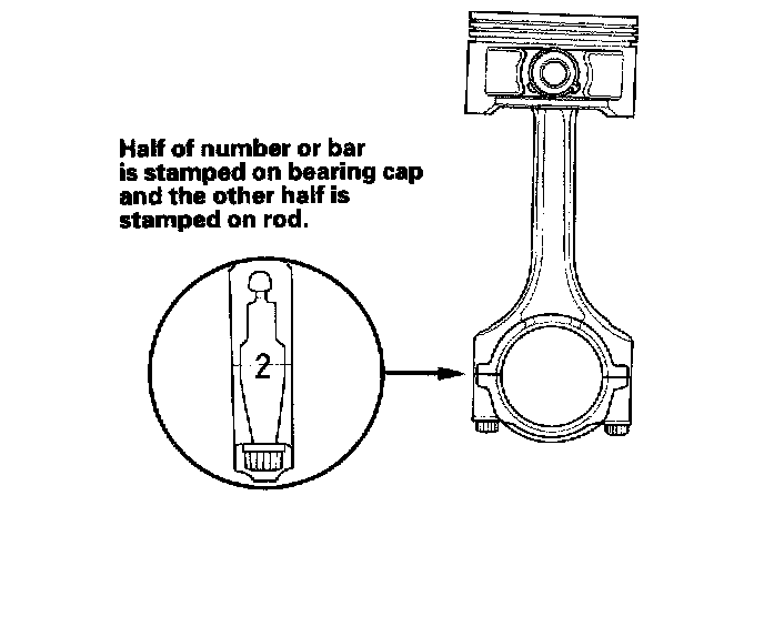 Numbers or bars have been stamped on the side of each connecting rod as a code for the size of the big end. Use them, and the letters or bars stamped on the crank (codes for rod journal size), to choose the correct bearings. If the codes are indecipherable because of an accumulation of dirt and dust, do not scrub them with a wire brush or scraper. Clean them only with solvent or detergent.