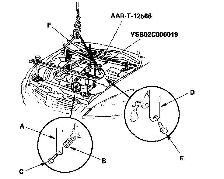 4. Install the engine support hanger (AAR-T-12566) to the vehicle, and attach the hook to the slotted hole in the engine balancer bar. Tighten the wing nut (F) by hand to lift and support the engine/transmission assembly.