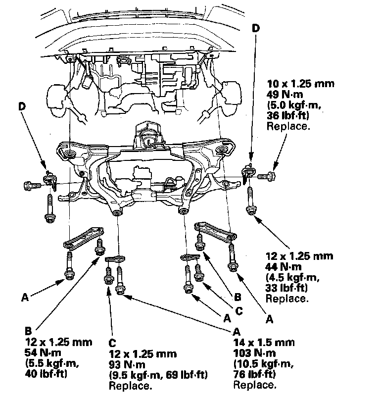 9. Loosely install the four front subframe mounting bolts (A) and the four 12 x 1.25 mm bolts (B), (C) with the stiffeners.