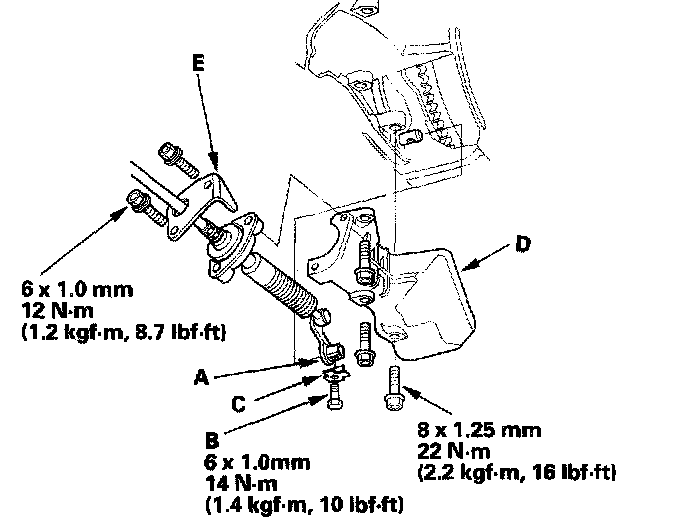 41. M/T model: Install the select cable (A) and shift cable (B) with the plastic washers (C), washers (D), and new cotter pins (E).