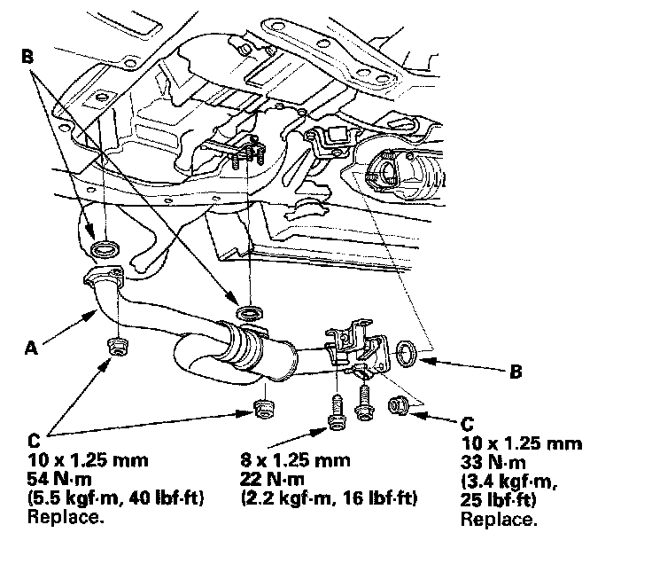 29. Install exhaust pipe A using new gaskets (B) and new self-locking nuts (C).