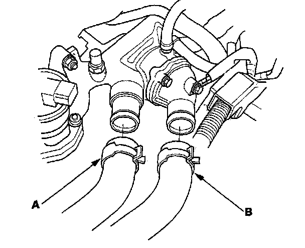 39. Install the upper radiator hose (A) and lower radiator hose (B).