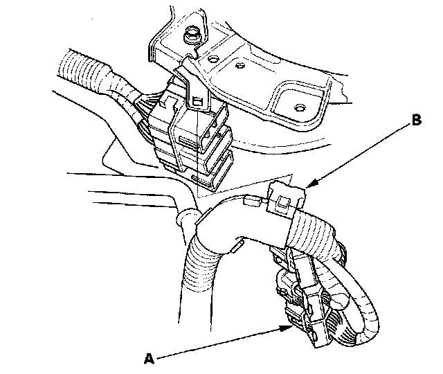 53. Connect the engine wire harness connectors (A), then install the harness clamp (B).