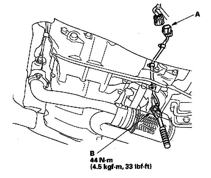 1. Disconnect the rear secondary HO2S (bank 1) 4P connector (A), then remove the rear secondary HO2S (B).