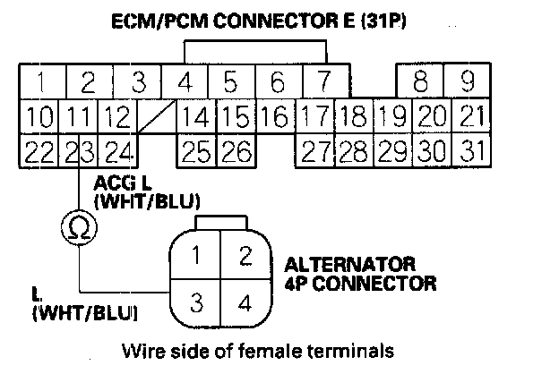 11. Check for continuity between ECM/PCM connector terminal E11 and alternator 4P connector terminal No.3.
