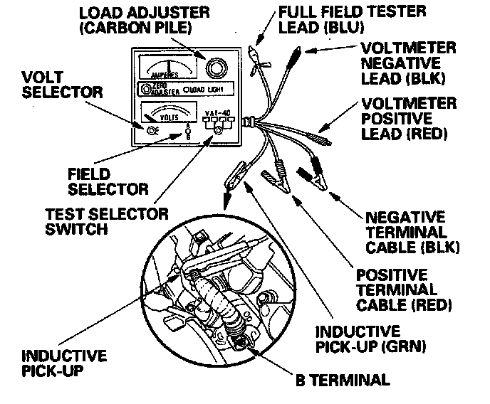 8. Place the inductive pick-up over the B terminal wire of the alternator so that the arrow points away from the alternator.