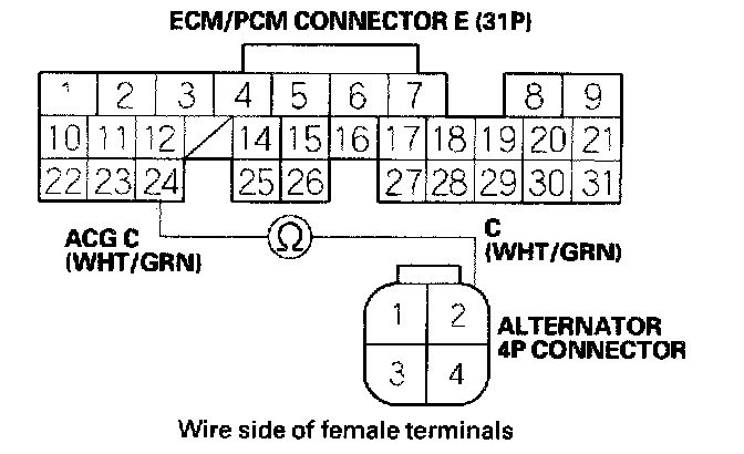 11. Check for continuity between ECM/PCM connector terminal E24 and alternator 4P connector terminal No. 2.