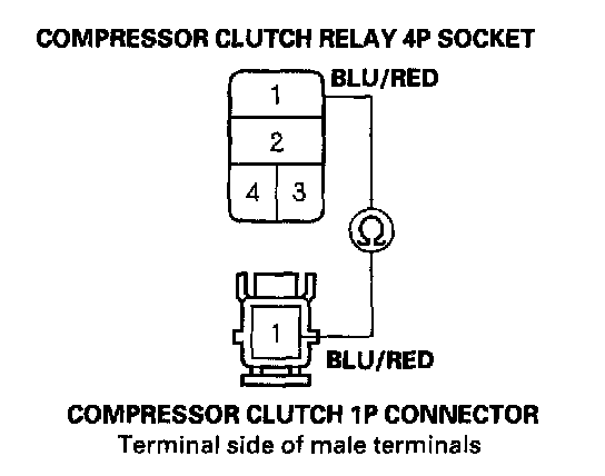 16. Check for continuity between the No.1 terminal of the compressor clutch relay 4P socket and the No.1 terminal of the compressor clutch 1 P connector.