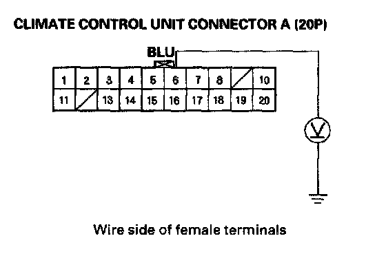 15. Measure the voltage between the No. 6 terminal of climate control unit connector A (20P) and body ground.
