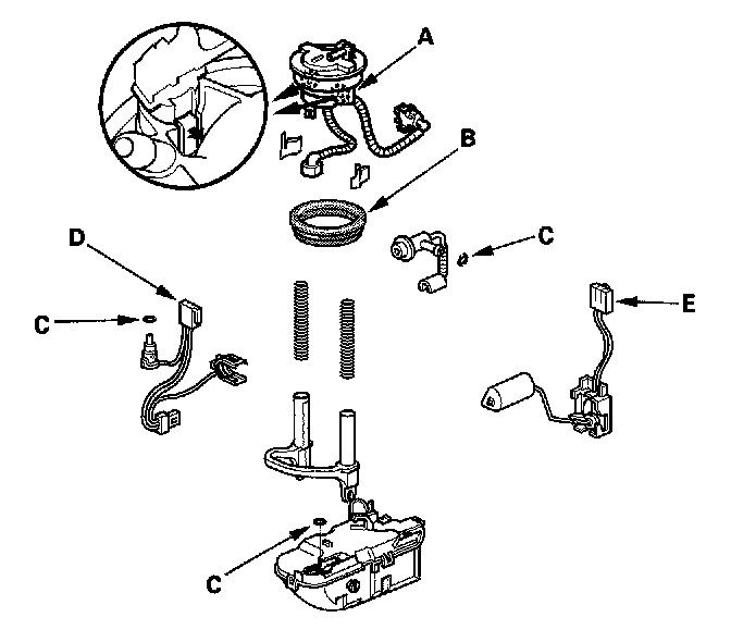 - When installing the fuel gauge sending unit (E), make sure the connection is secure and the connector is firmly locked into place. Be careful not to bend or twist it excessively.