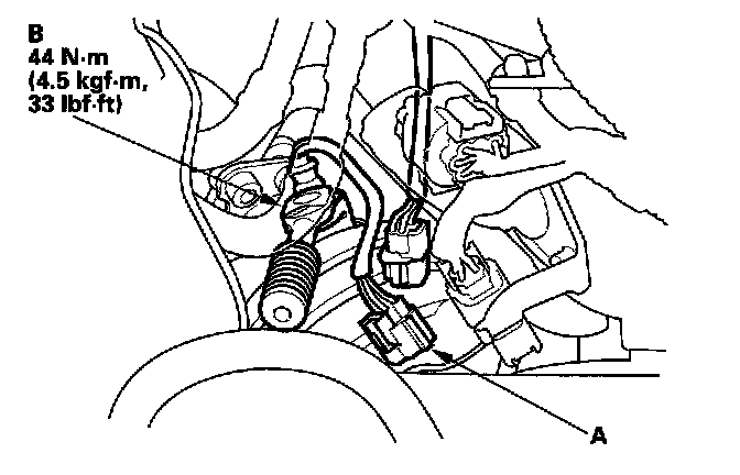 1. Disconnect the secondary HO2S 4P connector (A), then remove the secondary HO2S (B).