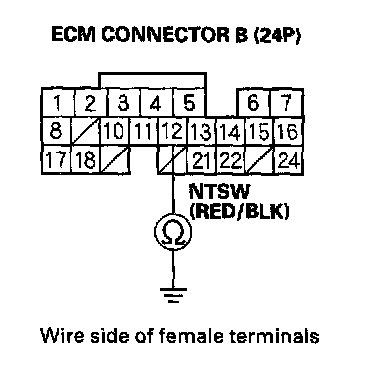 15. Check for continuity between ECM connector terminal B12 and body ground.