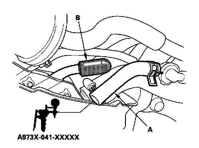 9. Fill the fuel tank with fuel, then check for fuel in the EVAP two way valve (A), and fuel tank vapor recirculation hose (B).