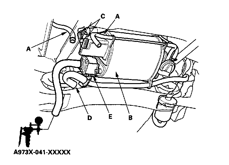 4. Disconnect the vacuum hoses (A) from the EVAP canister (B), then plug the ports with plugs (C).