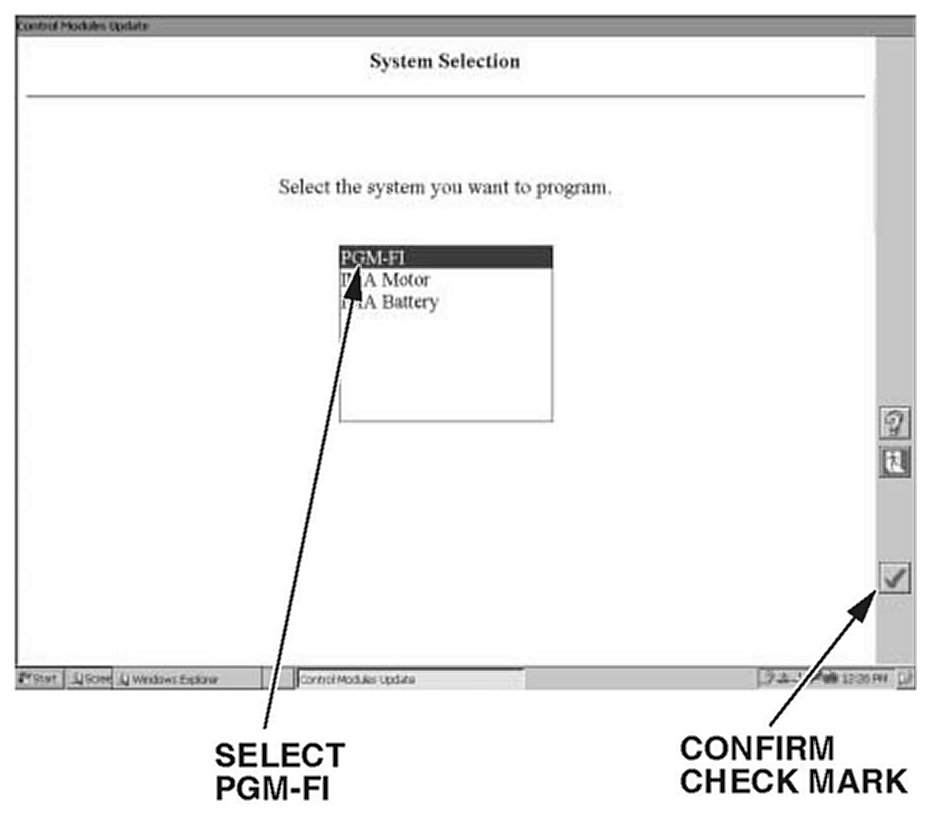 5. In the system select screen, select PGM-FI, then select the Confirm check mark icon.