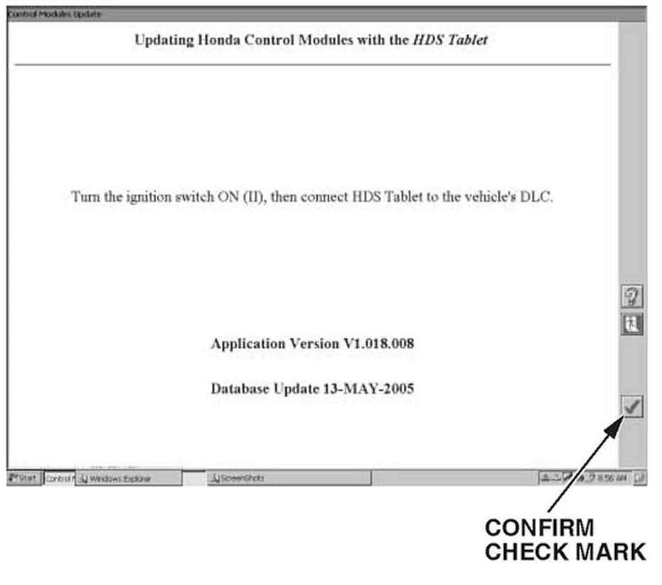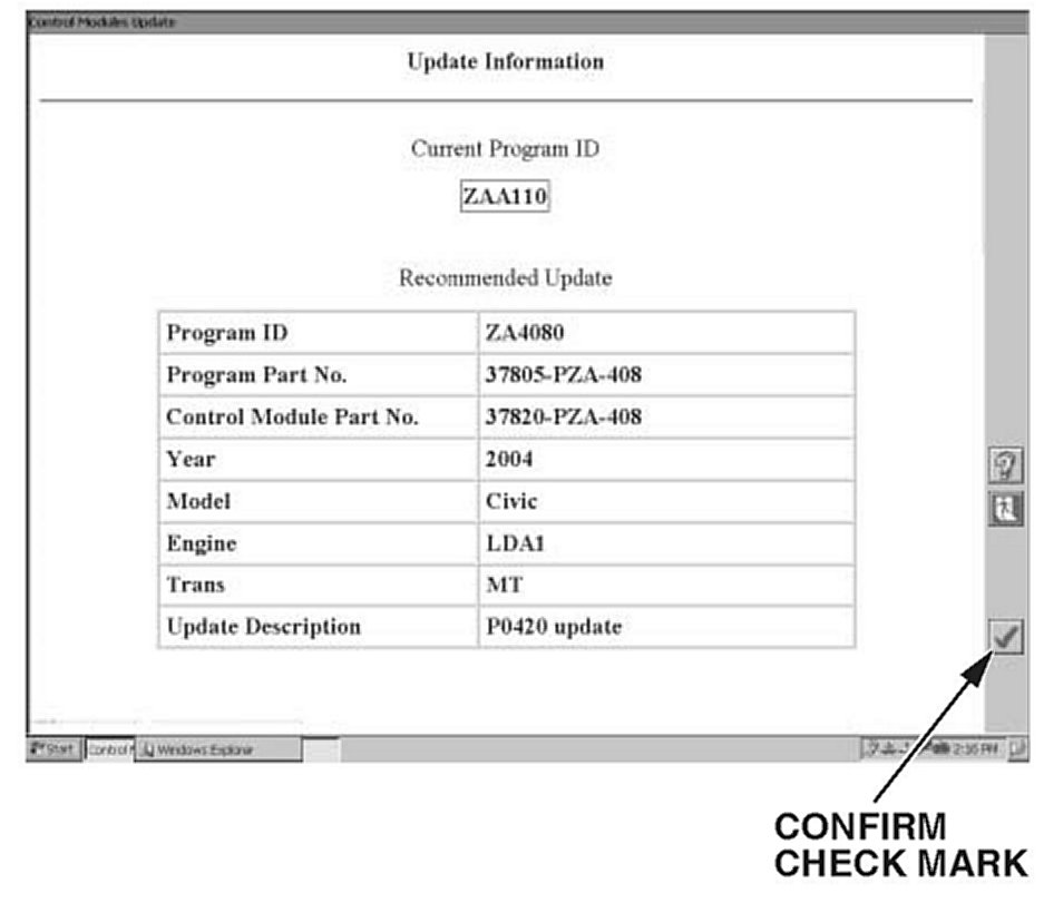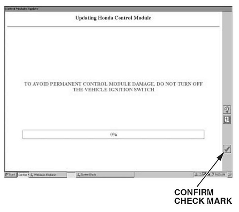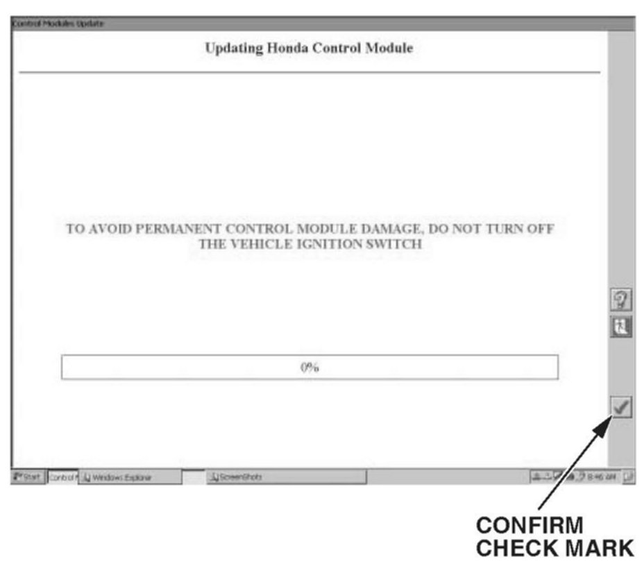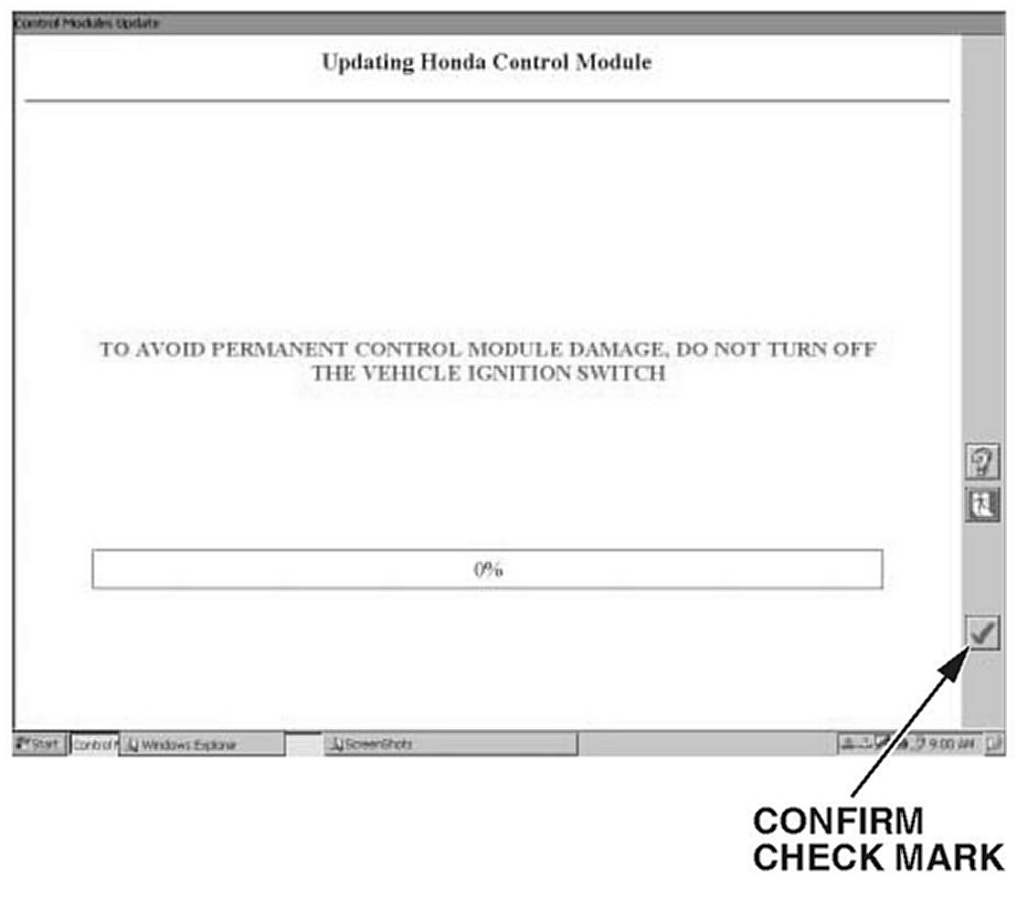 9. In the Updating Honda Control Module screen, select the Confirm check mark icon.