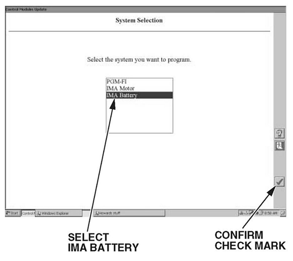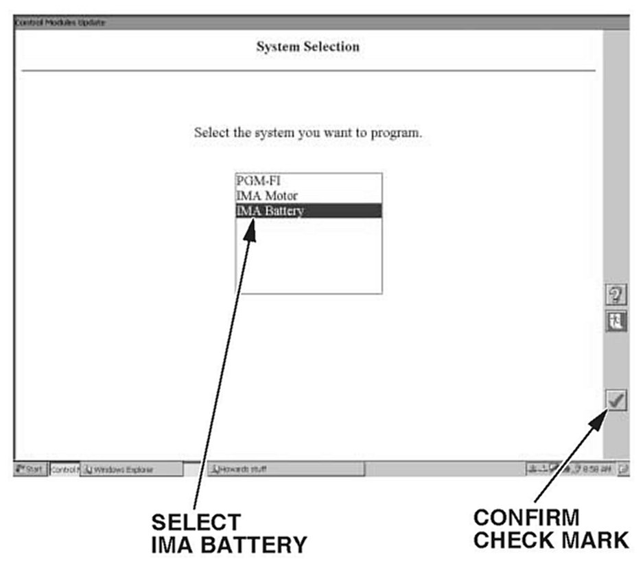 12. In the System Selection screen, select IMA Battery, then select the Confirm check mark icon.