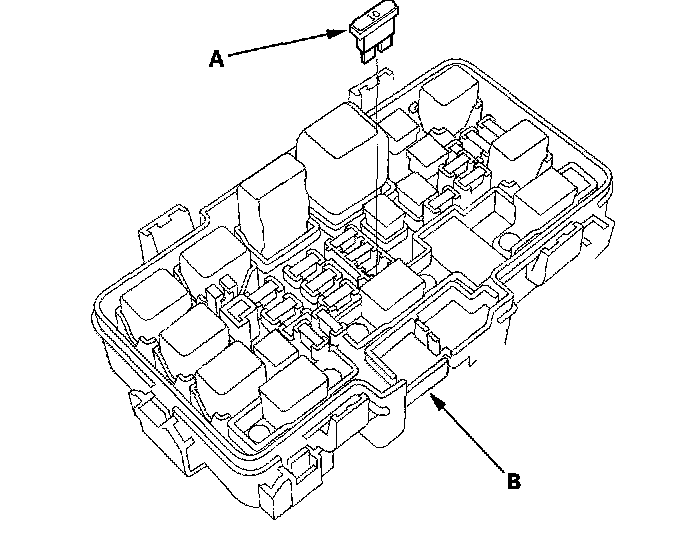 ^ Remove the No. 9 (10A) fuse (A) in the under dash fuse/relay box (B) for more than 10 seconds.