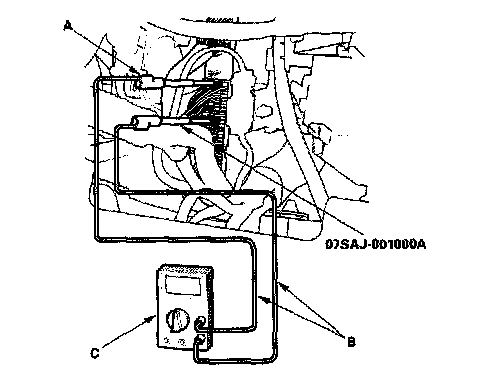 1. Connect the backprobe adapters (A) to the stacking patch cords (B), and connect the cords to a digital multimeter (C).
