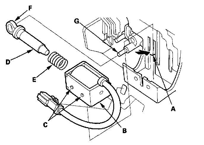 3. Push the lock tab (A), pry the shift lock solenoid (B) to clear the projected tips (C) with a screwdriver, and remove the shift lock solenoid.