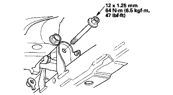 2. Remove the front transmission mount bracket mounting bolt and nut.