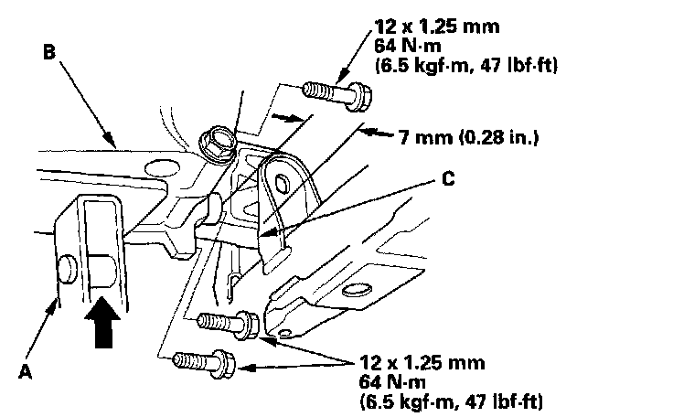 5. Remove the three bolts securing the front transmission mount, then remove the transmission mount (C).