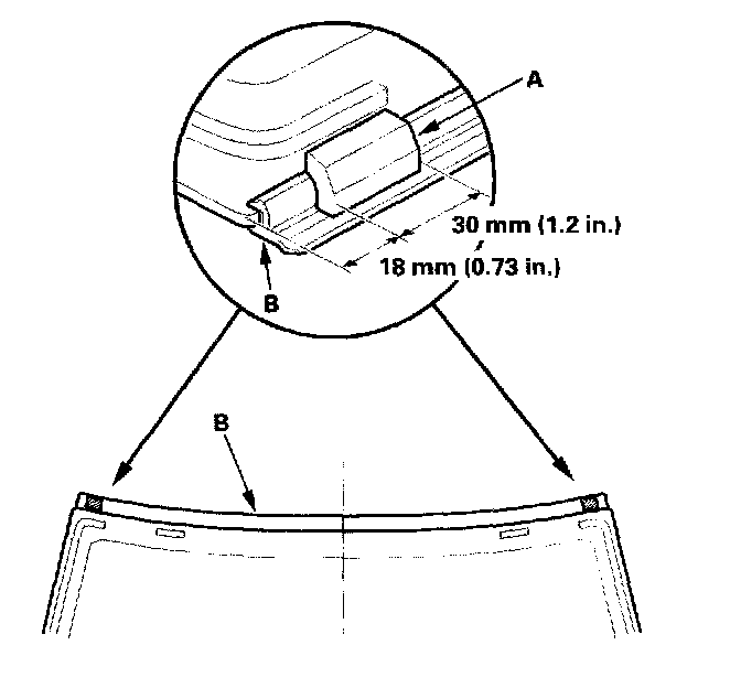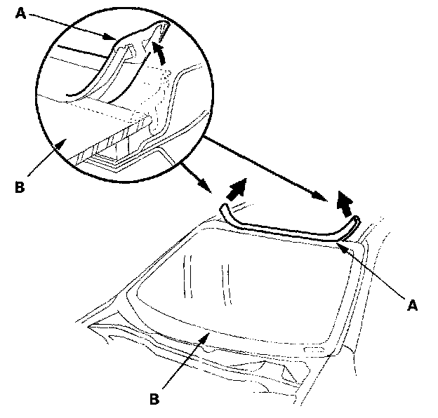 3. Remove the molding (A) from the upper edge of the windshield (B). If necessary, cut the molding with a utility knife.