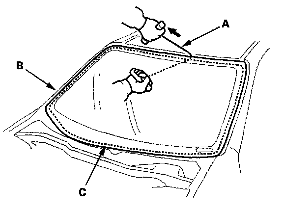 7. With a helper on the outside, pull the piano wire (A) back and forth in a sawing motion. Hold the piano wire as close to the windshield (B) as possible to prevent damage to the body and dashboard. Carefully cut through the rubber dam and adhesive (C) around the entire windshield.