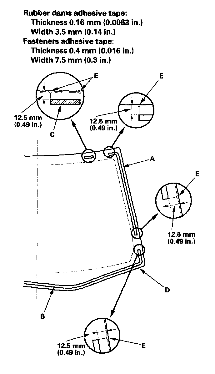 12. Attach the side rubber dams (A), lower rubber dam (B), and fasteners (C) with adhesive tape to the inside face of the windshield (D) as shown: