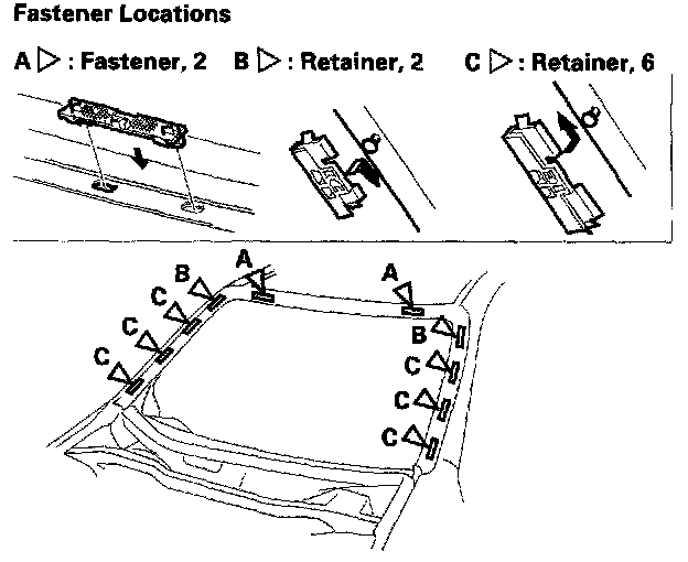 1. Pull up the side trim (A) to release the clips (B) from the retainers (C), then remove the trim from each side of the windshield.