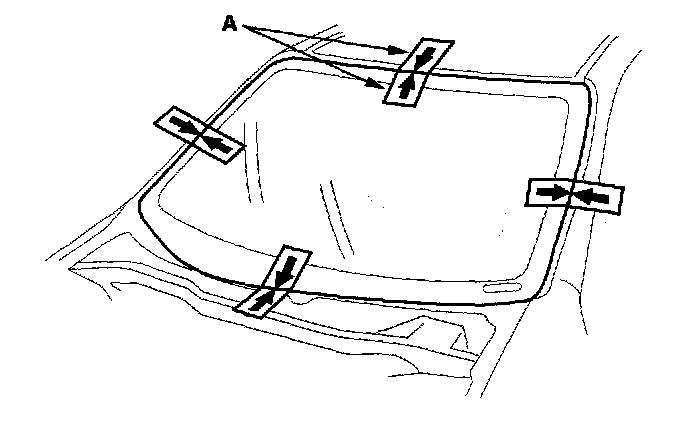 16. Set the windshield in the opening, and center it. Make alignment marks (A) across the windshield and body with a grease pencil at the four points shown. Be careful not to touch the windshield where adhesive will be applied.