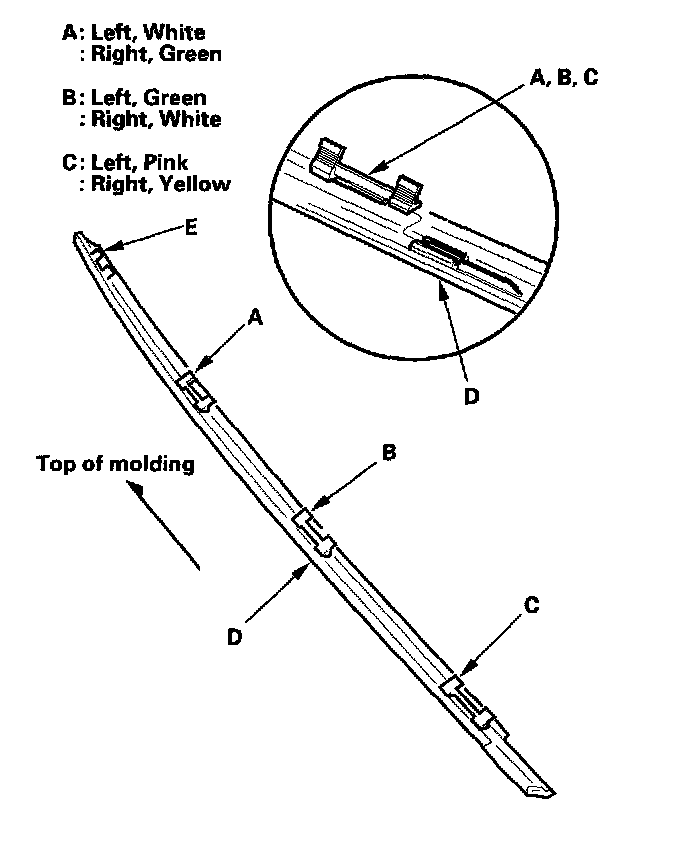 26. Install the clips (A, B, C) on both side moldings (D). If the clip (E) is damaged, replace the side molding and clip as an assembly.