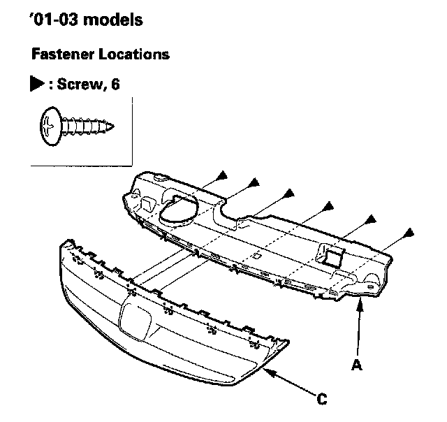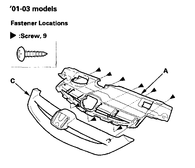 3. Remove the screws, then remove the front grille cover (A) ('01-03 models) or the front grille molding (B) ('04-05 models) from the front grille (C).