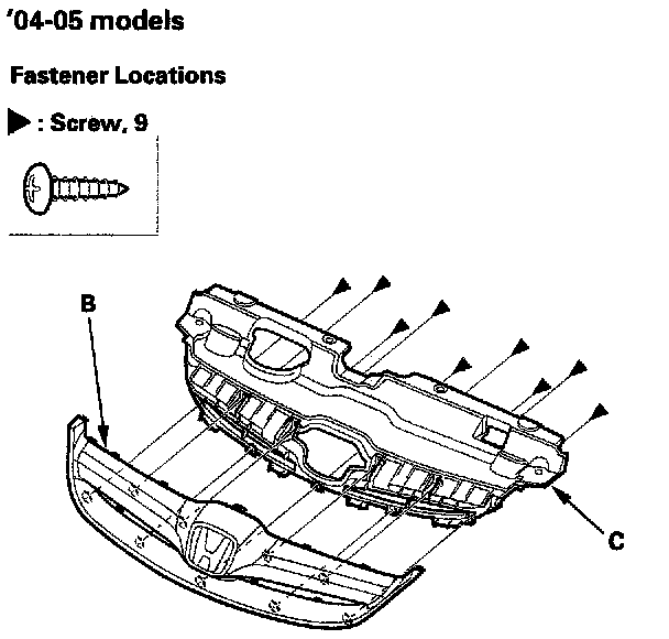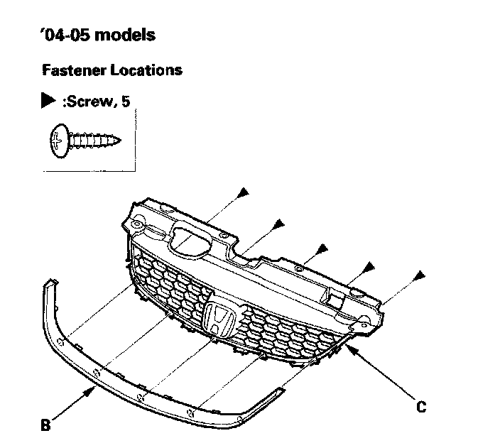 3. Remove the screws, then remove the front grille the front grille molding (B)('04-05 models) from the front grille (C).