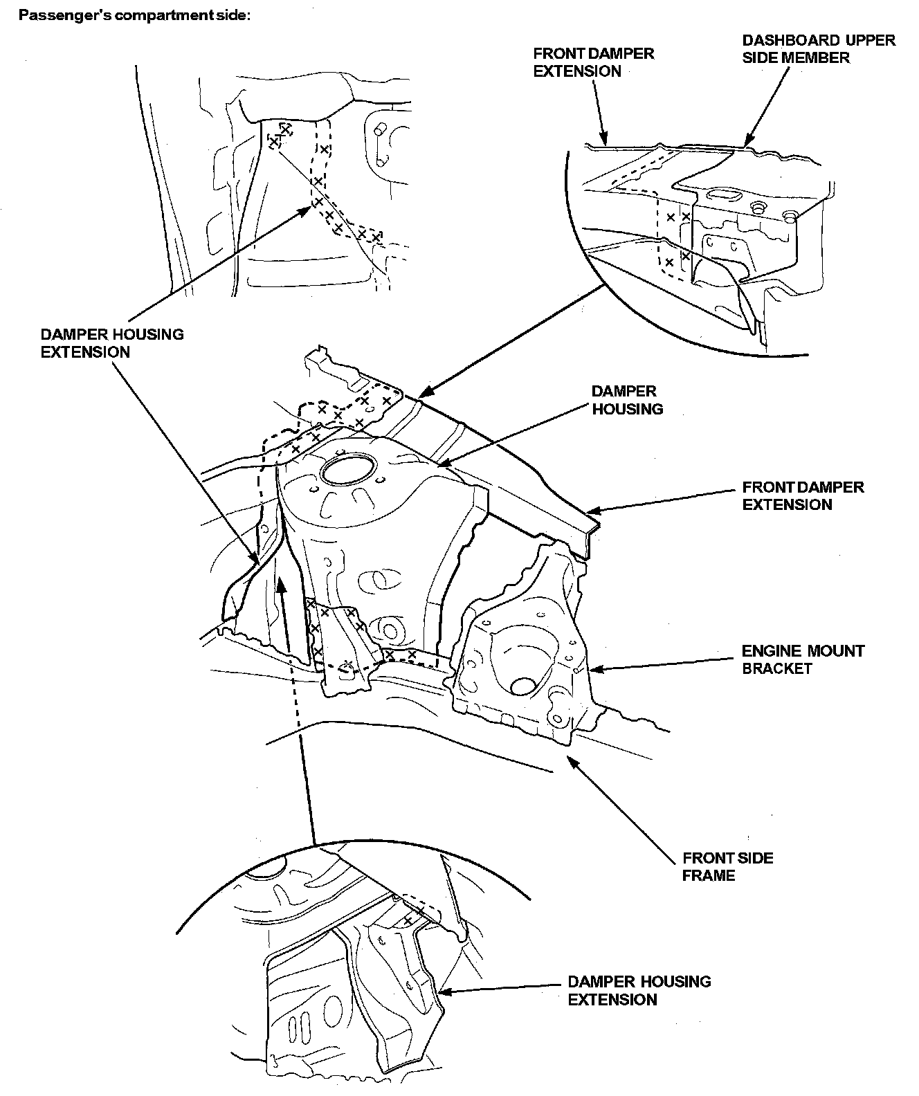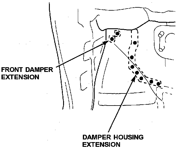 - Check the front damper extension and damper housing position, and check for damage. If necessary, remove the wheelhouse upper member, and replace the damper housing and front damper extension as an assembly, if possible.