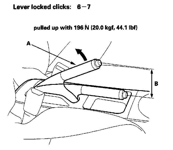 Check1. Pull the parking brake lever (A) with 196 N (20.0 kgf, 44.1 lbs.) of force to fully apply the parking brake. The parking brake lever should be locked within the specified number of clicks (B).