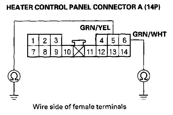 11. Check for continuity between the following terminals of heater control panel connector A (14P) and the recirculation control motor 7P connector.