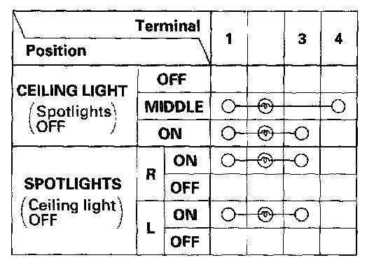 5. Check the bulbs. If the bulbs are OK, check for continuity between the terminals in each switch position according to the table.