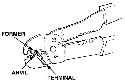 4. Position the terminal in the crimping tool slot with the solid portion of the terminal toward the anvil and the open section toward the former.