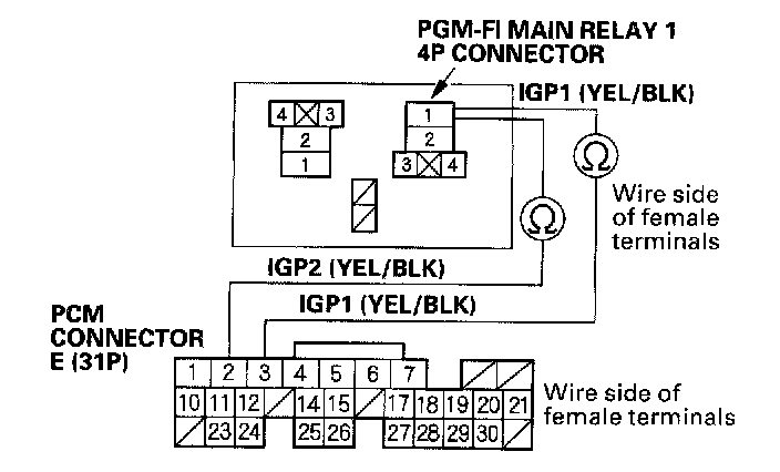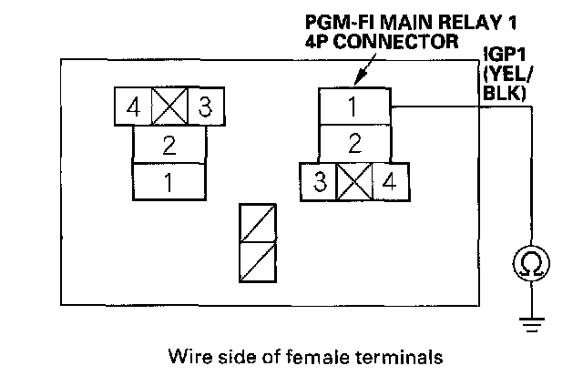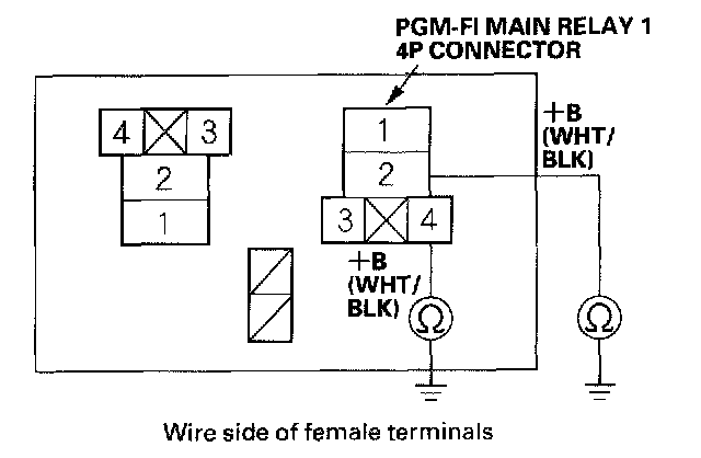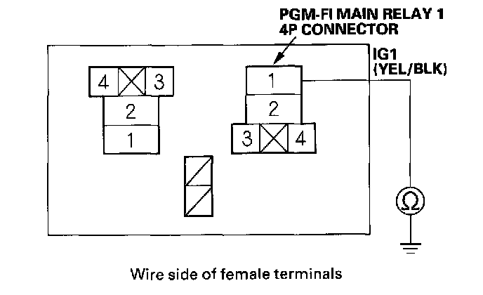 18. Check for continuity between body ground and PGM-FI main relay 1 4P connector terminals No.2 and No.4 individually.