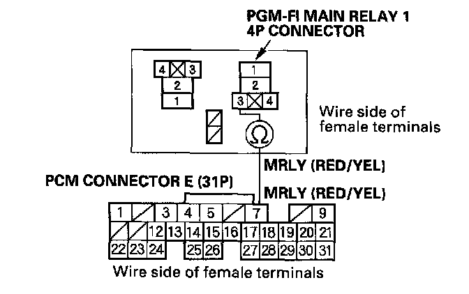 NO - Repair open in the wire between PGM-FI main relay 1 and the PCM (E7).