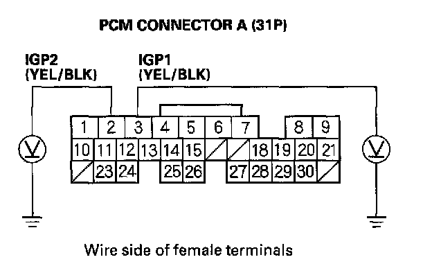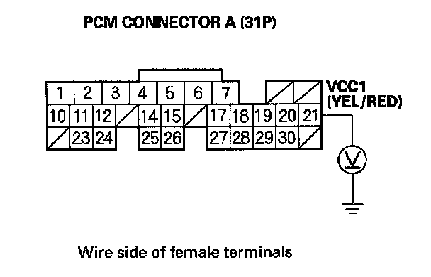 56. Disconnect the 3P connector from each of these sensors, one at a time, and measure voltage between body ground and PCM connector terminal A21 with the ignition switch ON (II).
