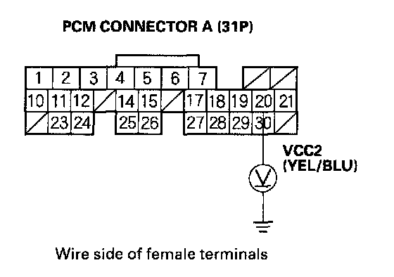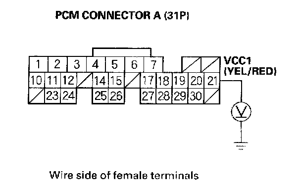 63. Disconnect the 3P connector from each of these sensors, one at a time, and measure voltage between body ground and PCM connector terminal A20 with the ignition switch ON (II).
