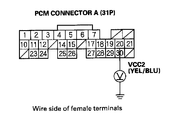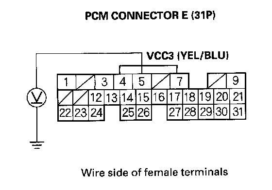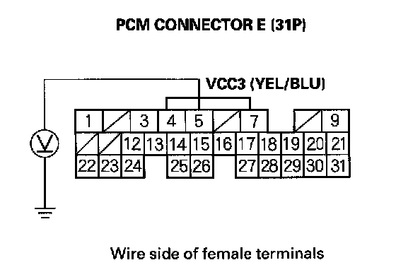 38. Measure voltage between PCM connector terminal E7 and body ground.