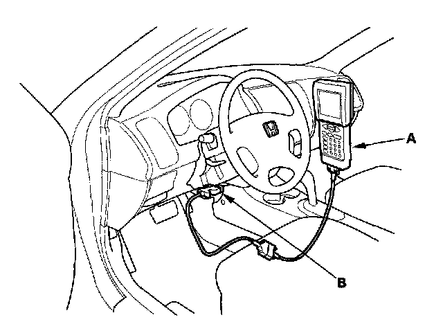 2. If the MIL stays on or the low fuel indicator light has been blinking, connect the Honda PGM Tester (A) or an OBD II scan tool to the Data Link Connector (DLC) (B) located under the driver's side of the dashboard.