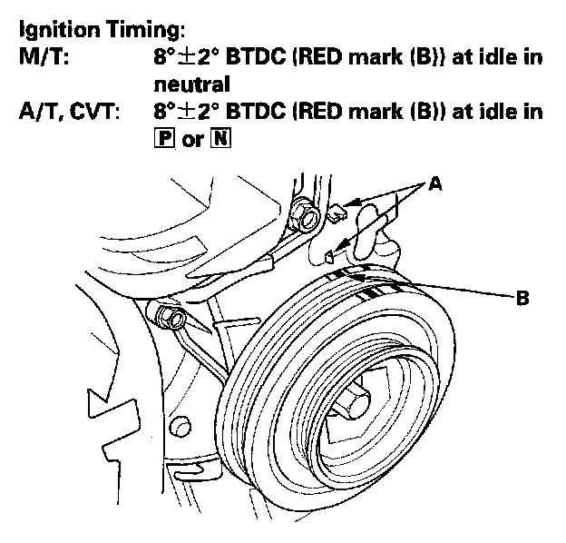 6. Aim light toward the pointers (A) on the timing belt cover. Check the ignition timing under no load conditions: headlights, blower fan, rear window defogger, and air conditioner are not operating. If the ignition timing differs from the specification, replace the engine control module (ECM)/powertrain control module (PCM).