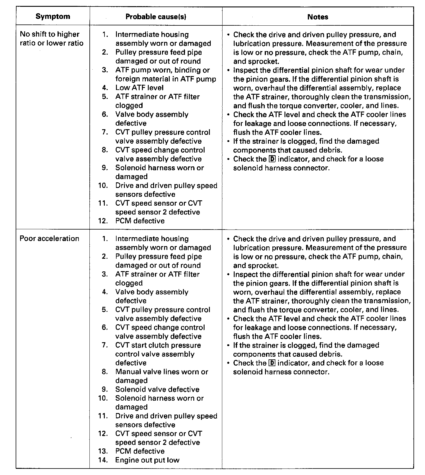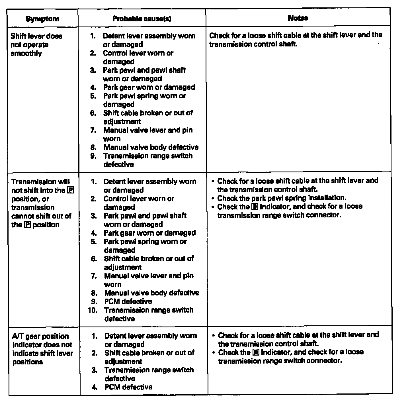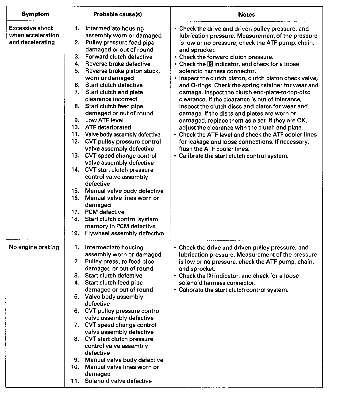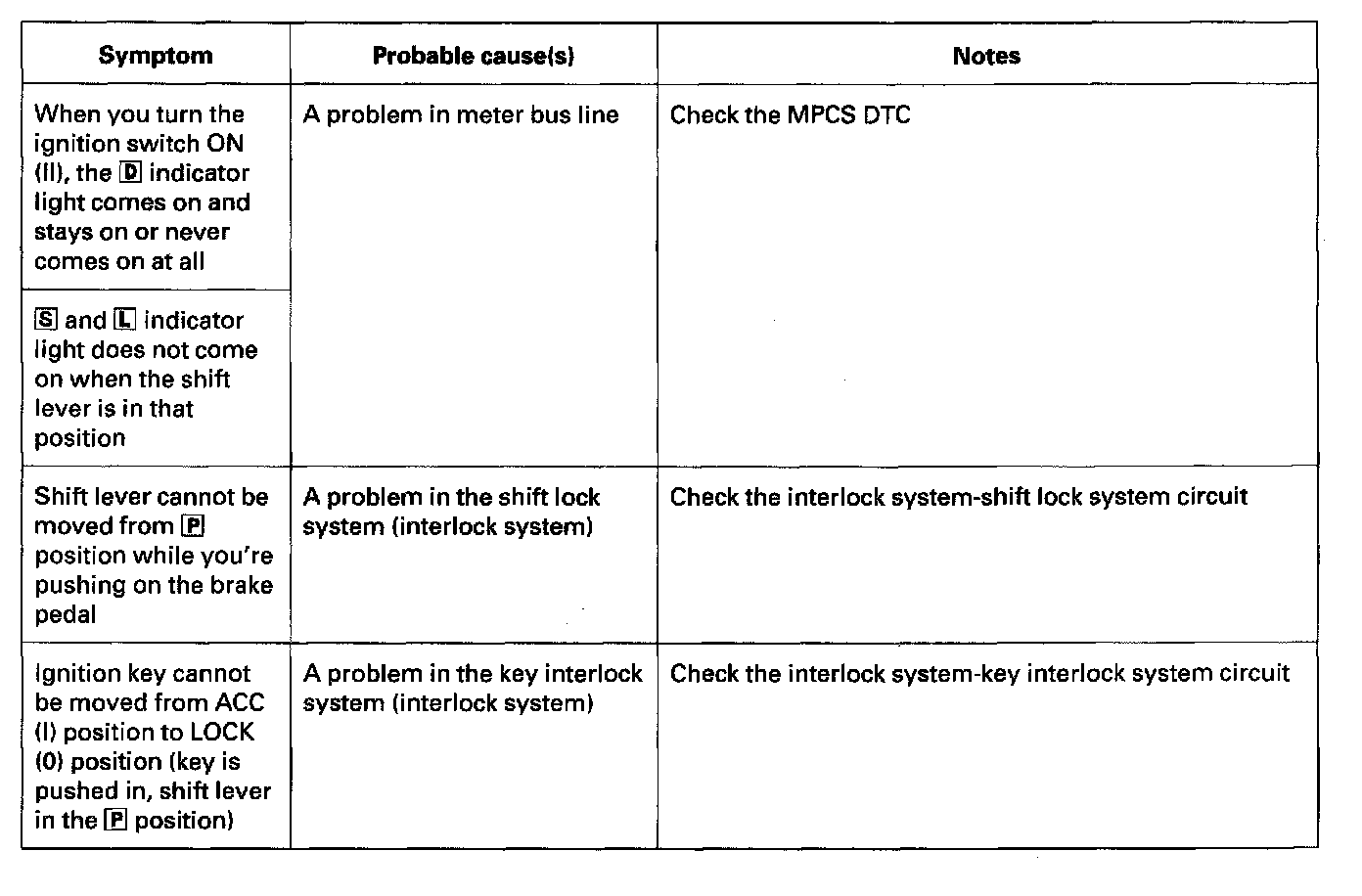 These symptoms DO NOT trigger diagnostic trouble codes (DTCs) or cause the D indicator to blink. If the malfunction indicator lamp (MIL) was reported ON or the D indicator light has been blinking, check for DTCs. If the vehicle has one of the symptoms in the following chart, check the probable cause(s) for it. In the sequence listed, until you find the problem.