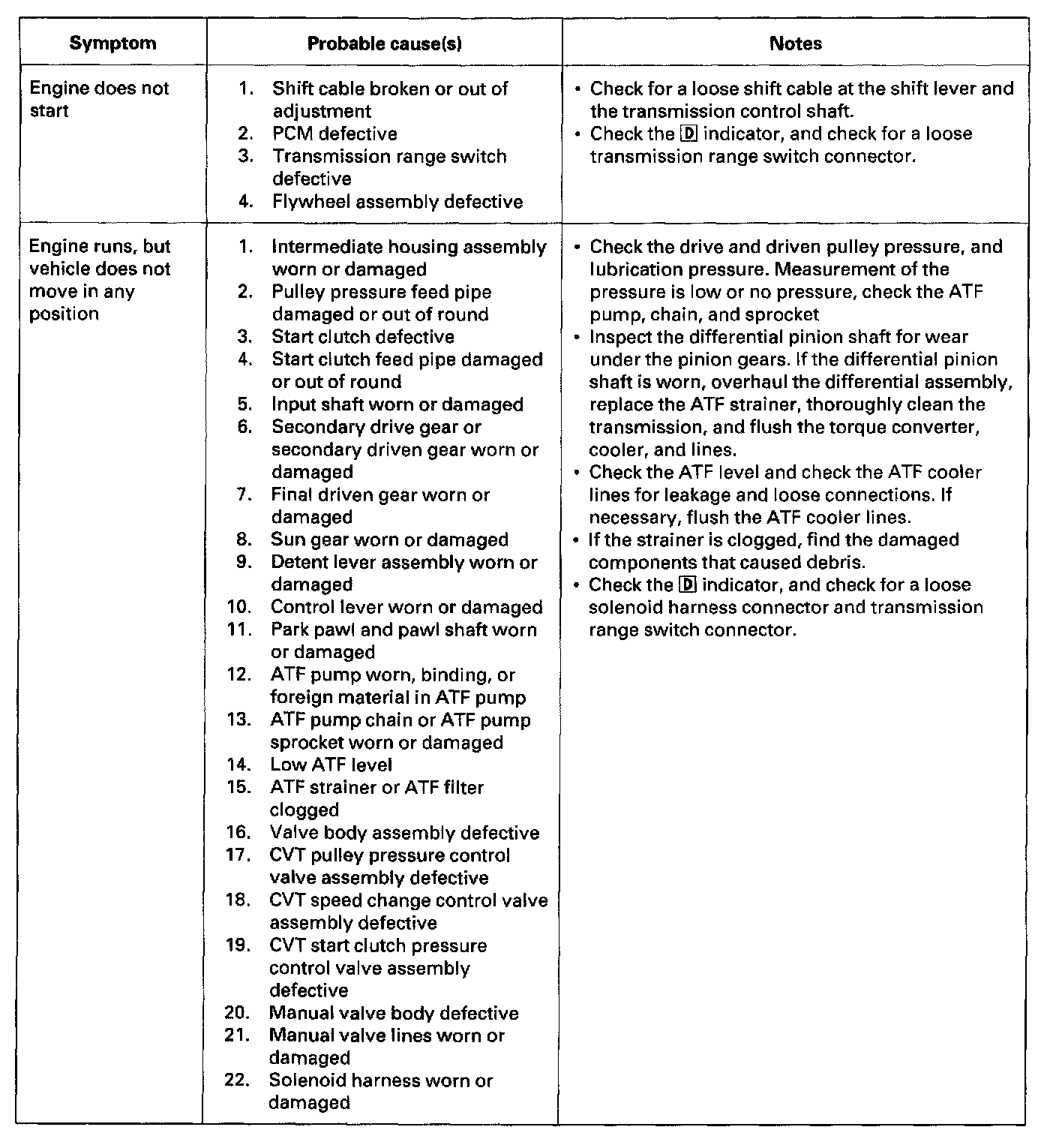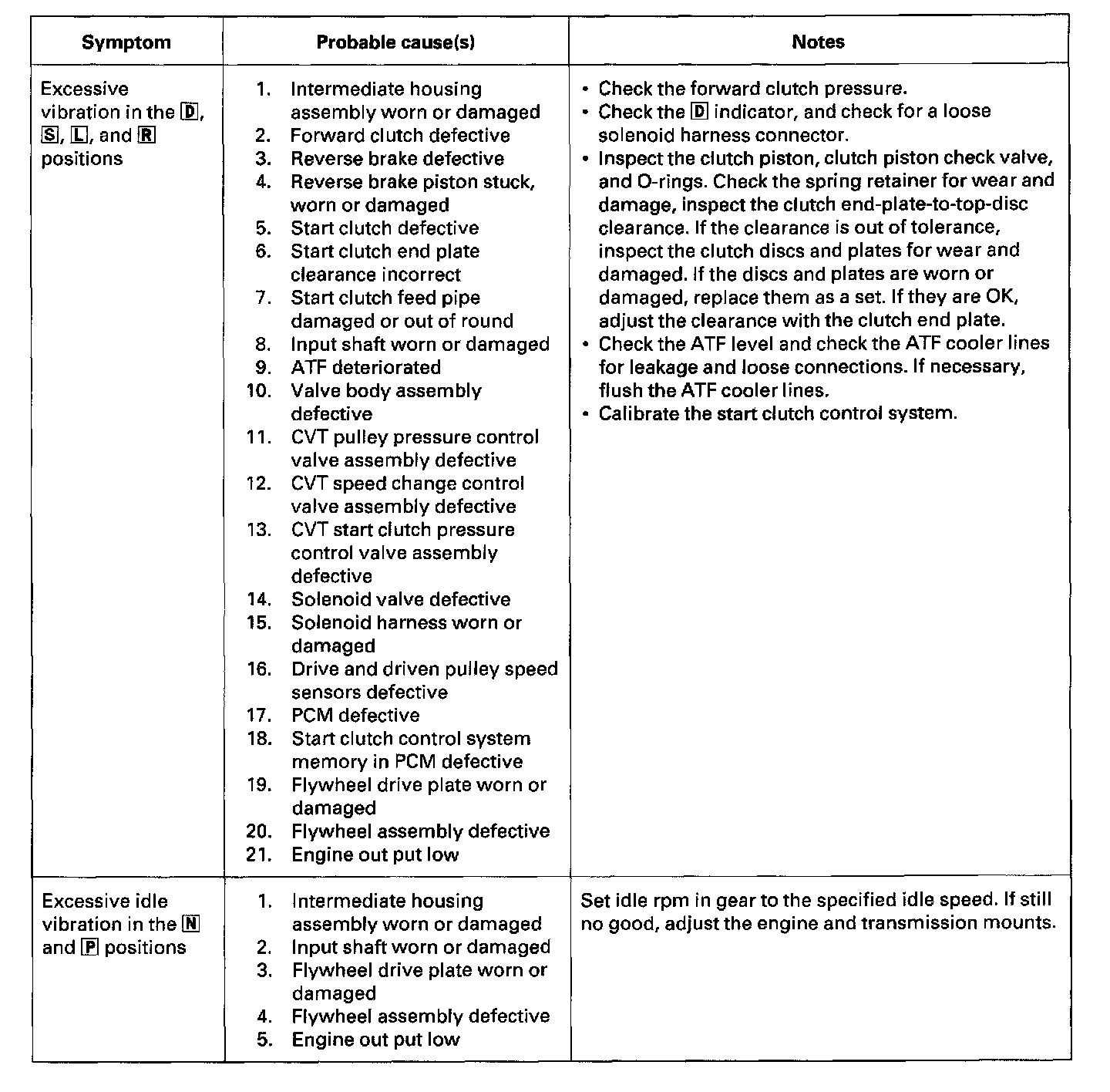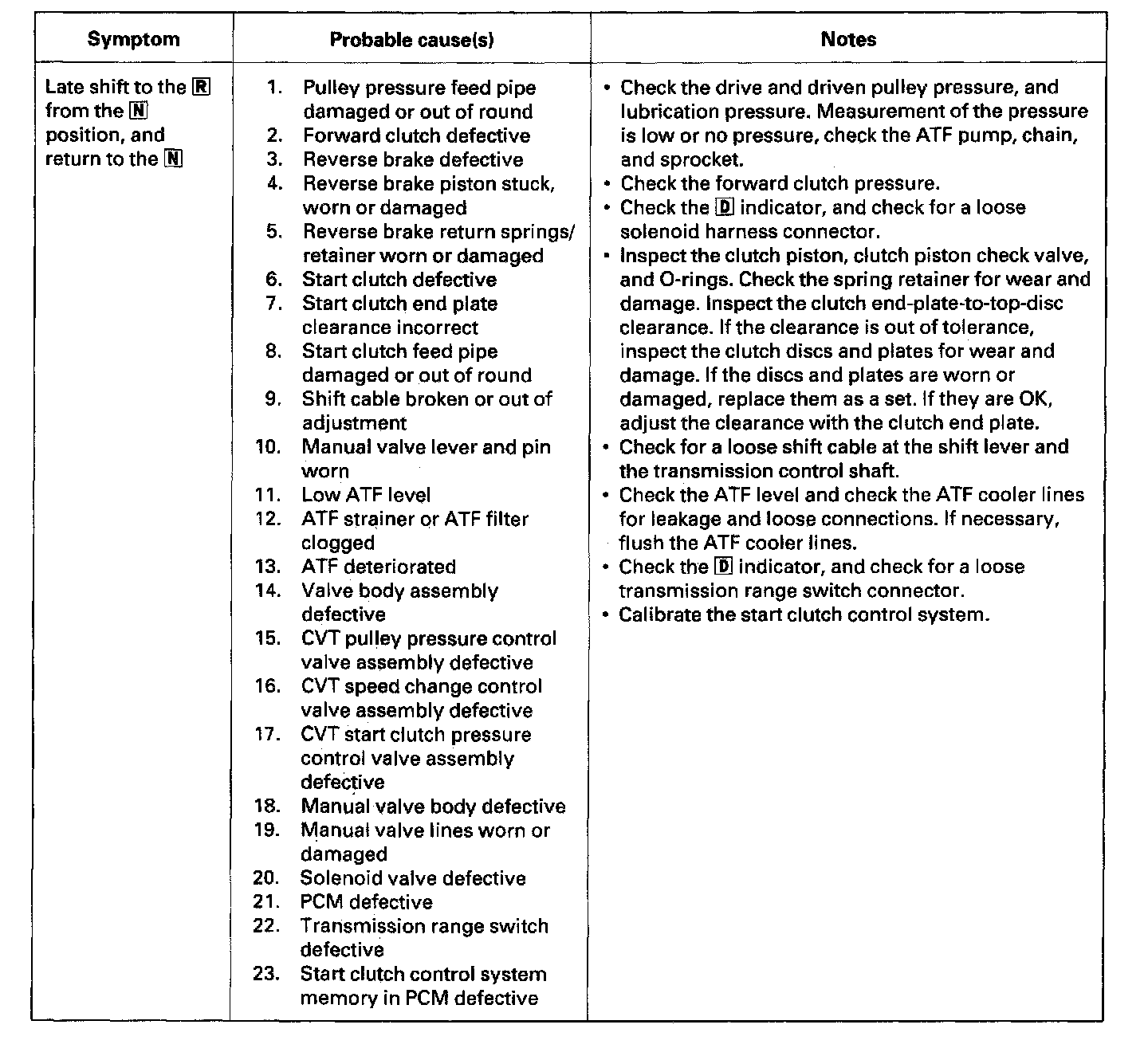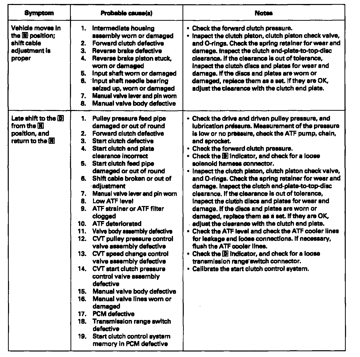 These symptoms DO NOT trigger diagnostic trouble codes (DTCs) or cause the D indicator to blink. If the malfunction indicator lamp (MIL) was reported ON or the D indicator light has been blinking, check for DTCs. If the vehicle has one of the symptoms in the following chart, check the probable cause(s) for it. In the sequence listed, until you find the problem.